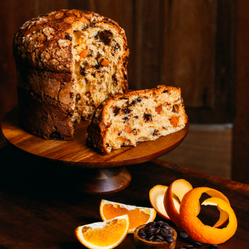 Massa de fermentação natural, gotas de chocolate e laranja glaceada. 800g.